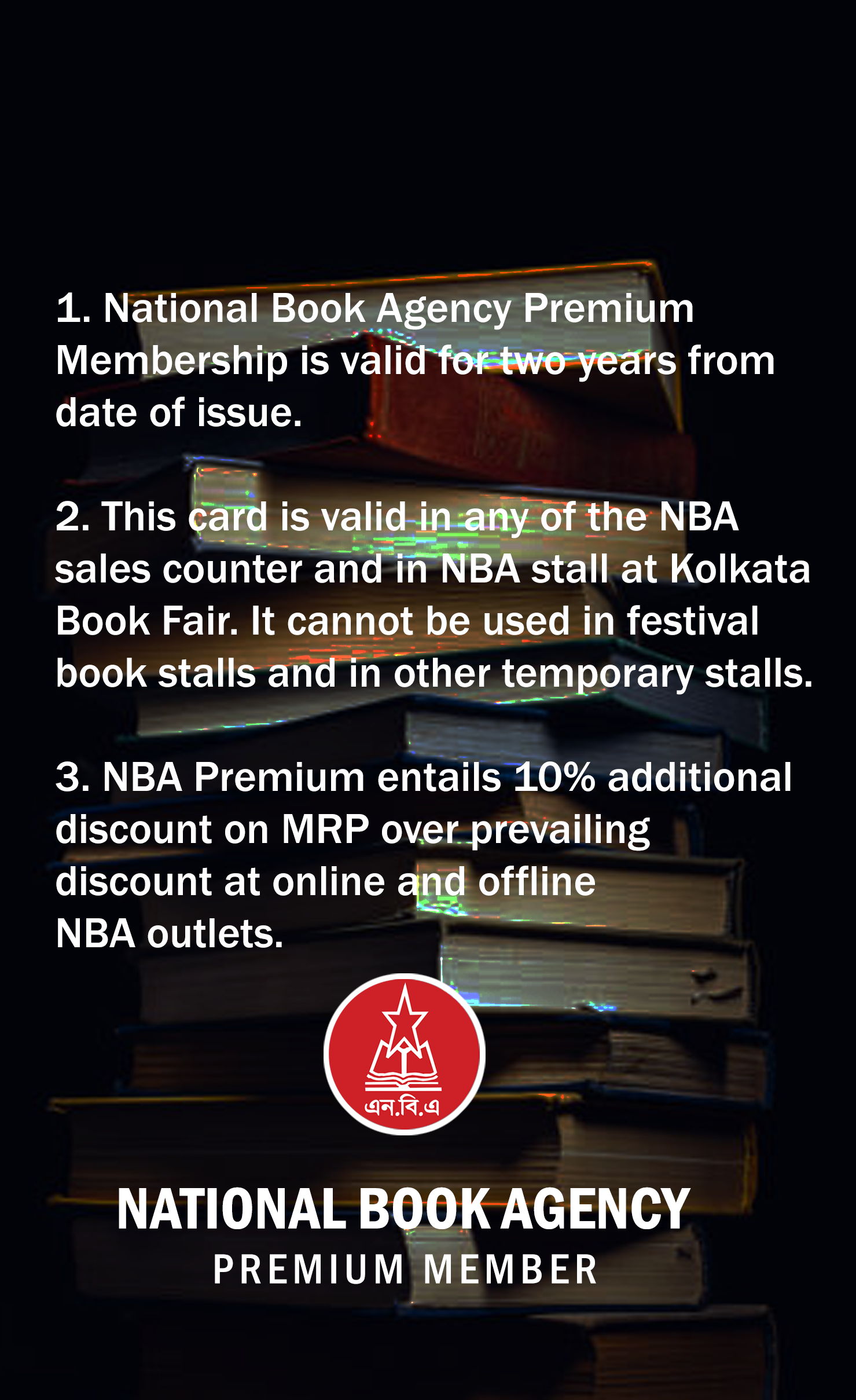 - এই কার্ড এন বি এর নিজস্ব বিক্রয় কেন্দ্র কলকাতা বইমেলার নিজস্ব স্টলে ব্যবহার করা যাবে। শারদ বুক স্টল অথবা সমাবেশ উপলক্ষে আয়োজিত স্টলে এই সুবিধা পাওয়া যাবে না।